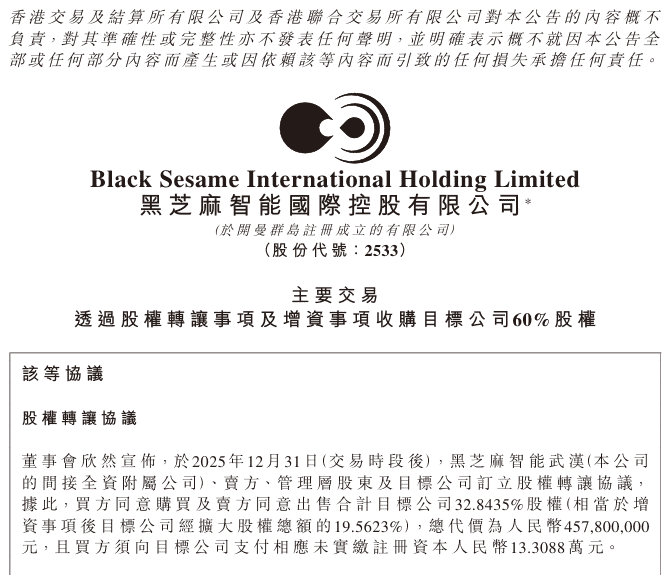 2025年12月31日晚间,国内车规级AI芯片领域龙头企业黑芝麻智能科技有限公司正式宣布,通过股权转让与增资相结合的方式完成对亿智电子科技有限公司的战略控股收购。