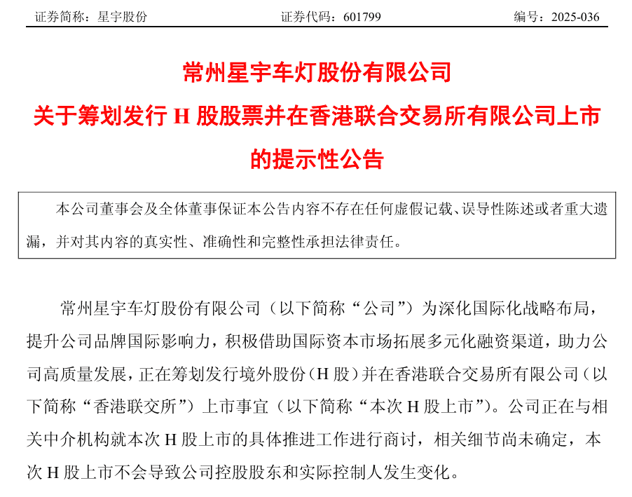 12月30日,国内智能车灯龙头企业星宇股份(601799.SH)发布公告称,公司拟申请首次公开发行境外上市外资股(H股)并在香港联合交易所主板上市。