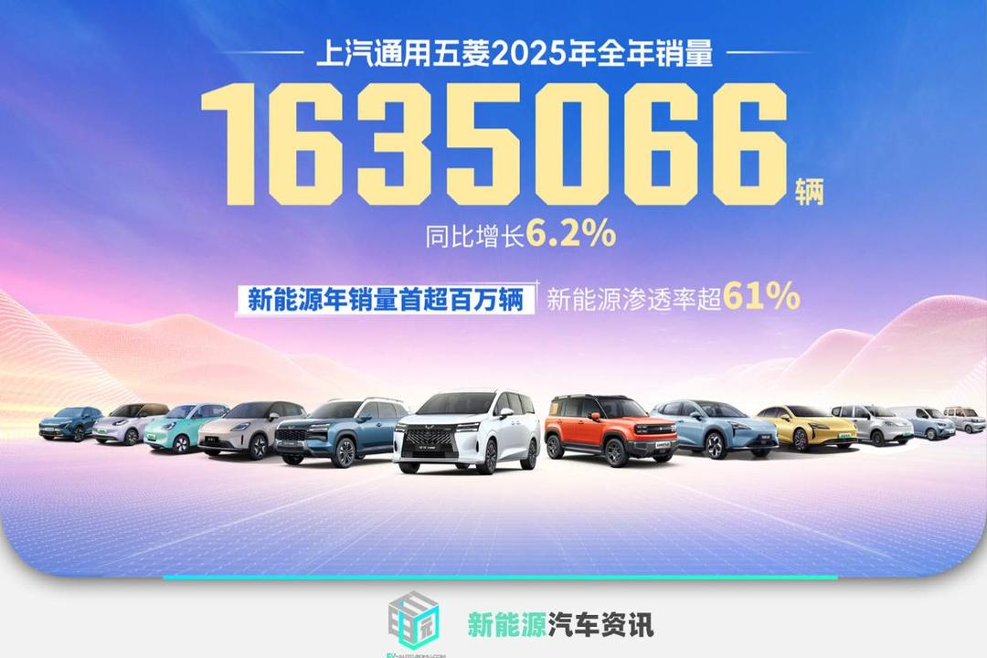 2026年1月1日,上汽通用五菱正式发布2025年全年销量,全年整体销量1,635,066辆,同比增长6.2%;其中,新能源汽车年销量1,000,066辆,年度首次突破百万台,同比增长31.9%。海外年度出口266,868台/套,同比增长18.6%,连续十年增长。