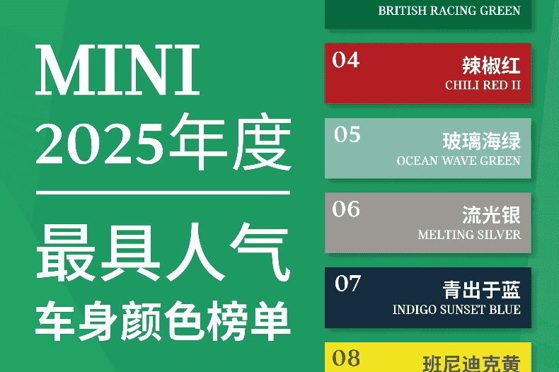 MINI 2025年推出TOP5彩色车色,白、灰、绿等色深受消费者喜爱,展现品牌与车主的双向奔赴。